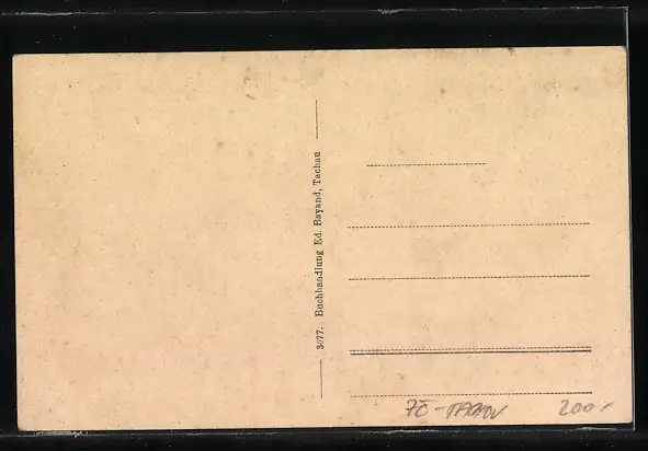 Personenbezogene Daten auf der Rückseite der Karte wurden durch blauen Textmarker unkenntlich gemacht. Die blauen Stellen sind auf die Vorderseite durchgeweicht und wirken sich negativ auf das Postkartenfoto aus
