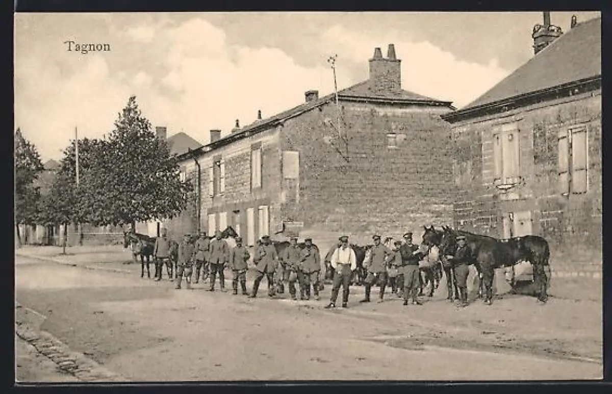 AK Tagnon, Soldats et chevaux alignés dans une rue du village