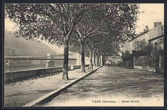 AK Tain, Quai Scoly bordé d`arbres avec vue sur le fleuve et le pont