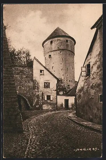 Personenbezogene Daten auf der Rückseite der Karte wurden durch blauen Textmarker unkenntlich gemacht. Die blauen Stellen sind auf die Vorderseite durchgeweicht und wirken sich negativ auf das Postkartenfoto aus