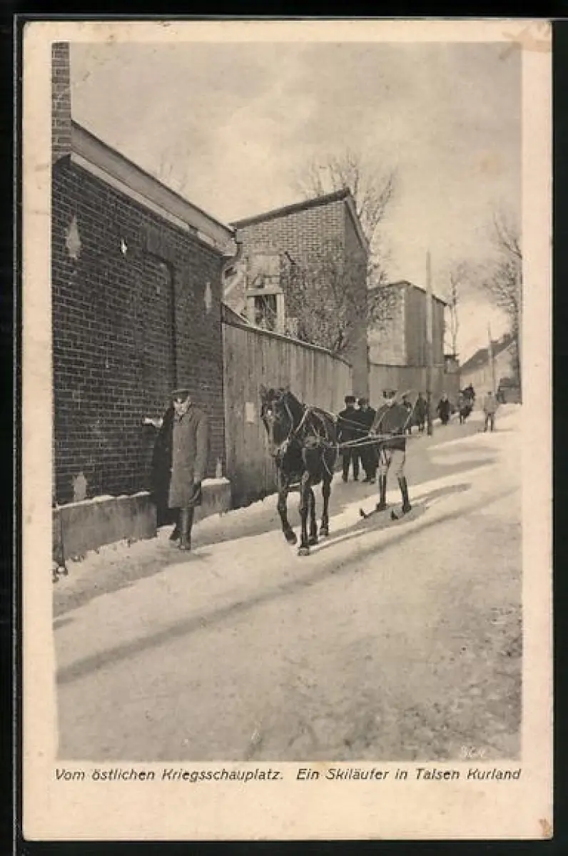 AK Talsen /Kurland, Ein Skiläufer mit Pferd