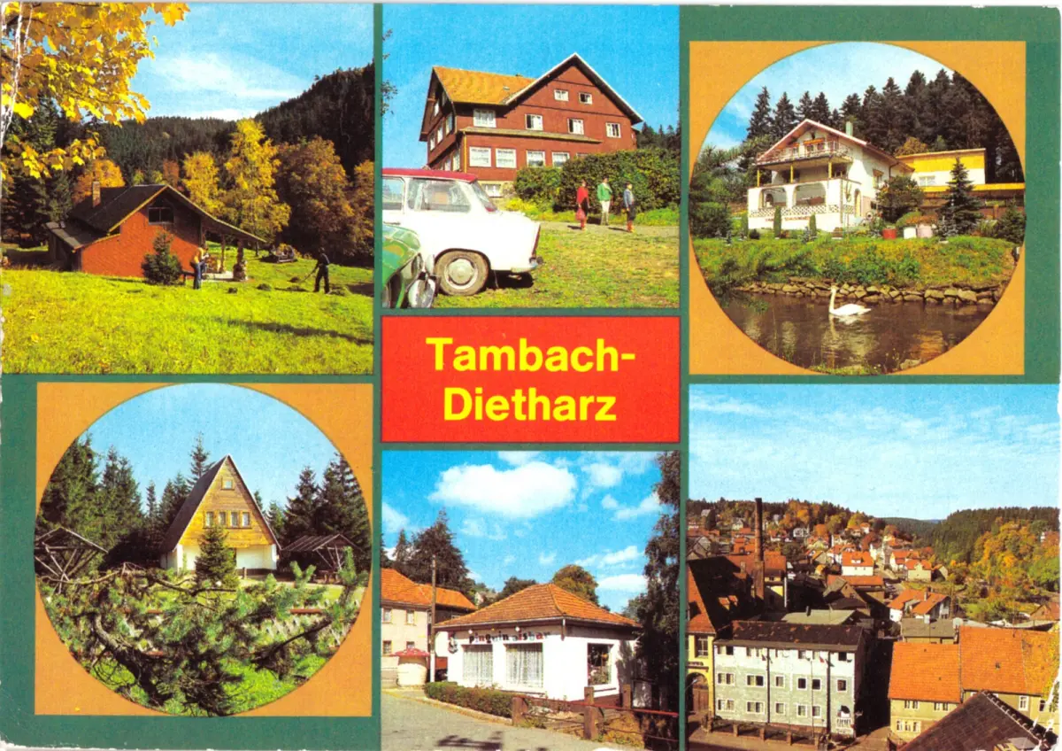AnsichtskarteTambach-Dietharz Kr. Gothasechs Abb. - Bergsteigerhütte am Falkenstein, Berggaststätte Ebertswiese, "Haus am Schwanenteich", Versorgungseinrichtung am Kratersee, Pinguin-Eisbar, Blick vom Kirchturm