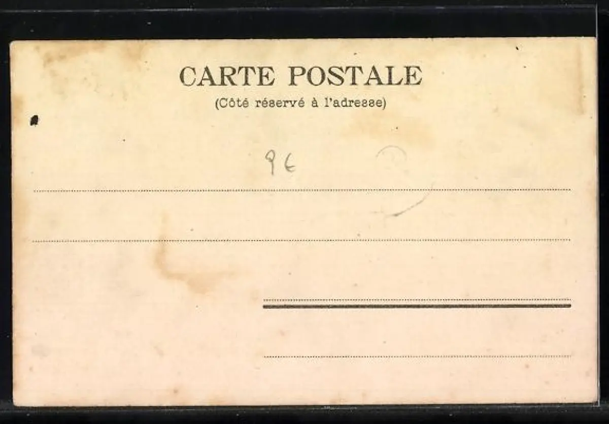 Personenbezogene Daten auf der Rückseite der Karte wurden durch blauen Textmarker unkenntlich gemacht. Die blauen Stellen sind auf die Vorderseite durchgeweicht und wirken sich negativ auf das Postkartenfoto aus