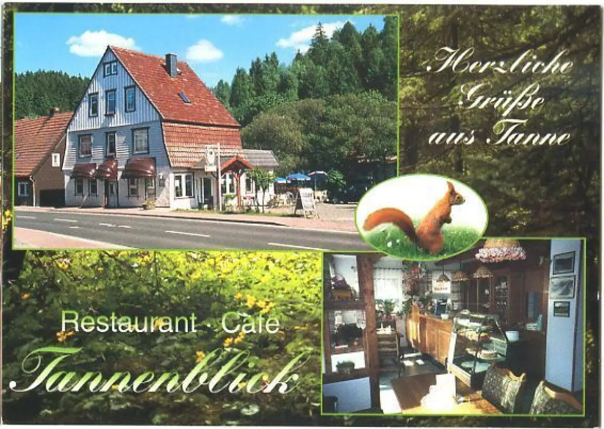 Ansichtskarte, Tanne HarzCafé und Restaurant Tannenblick, Bodetalstr. 19 Druckjahr: ca. 1999 Erhaltung 1-2, Beförderungsspuren postalisch gelaufen, gestempelt: 27.9.99 Verlag: Kurch-Druck