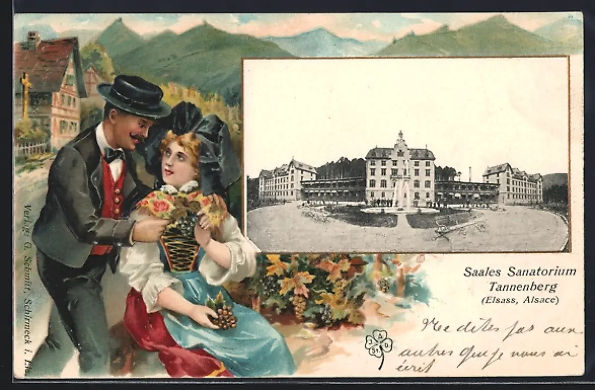 AK Tanneberg, Saales Sanatorium mit Passepartoutrahmen Paar in Trachten