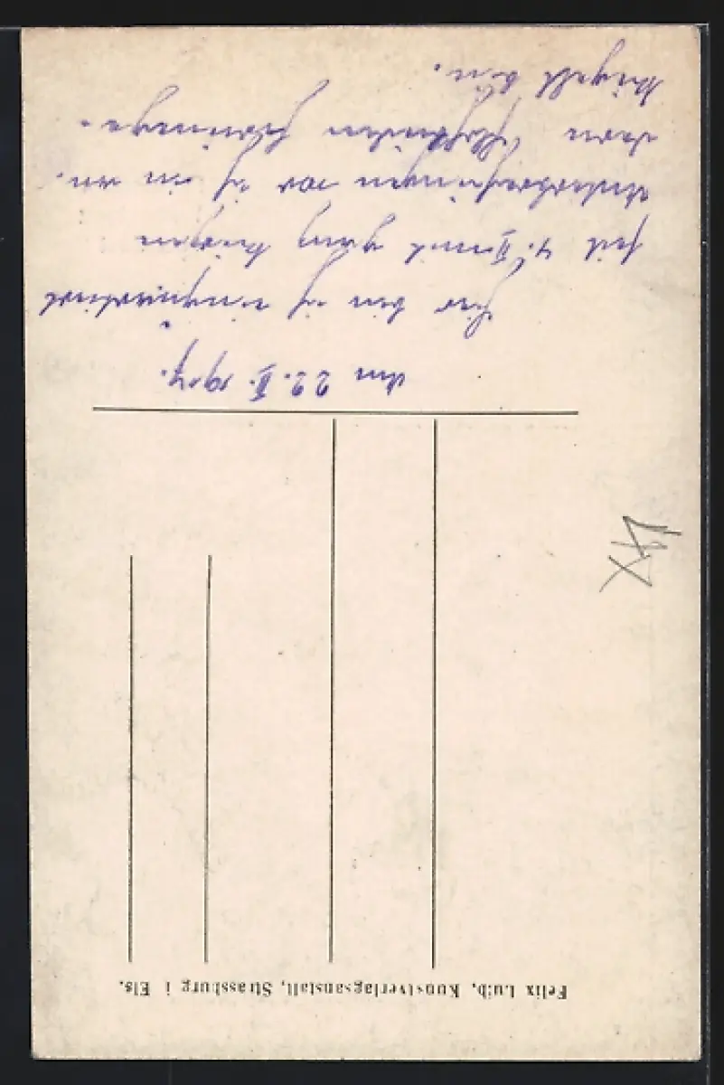 Personenbezogene Daten auf der Rückseite der Karte wurden durch blauen Textmarker unkenntlich gemacht. Die blauen Stellen sind auf die Vorderseite durchgeweicht und wirken sich negativ auf das Postkartenfoto aus