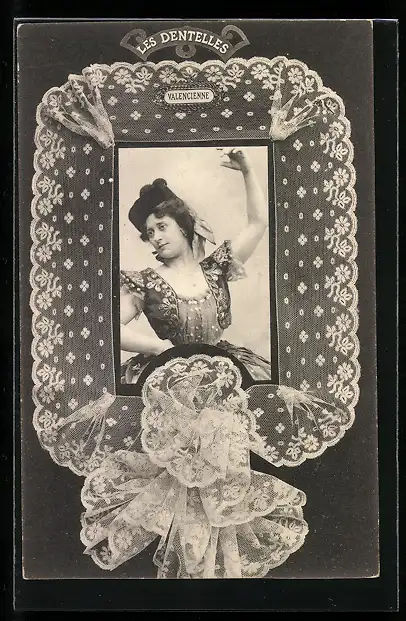 AK Tanzende Frau präsentiert das Handwerk der Spitzenklöppelei