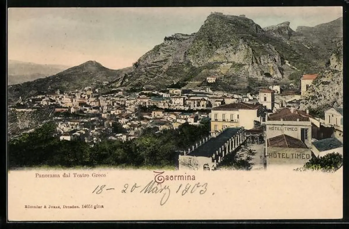 AK Taormina, Panorama dal Teatro Greco, Hotel Timeo vorne