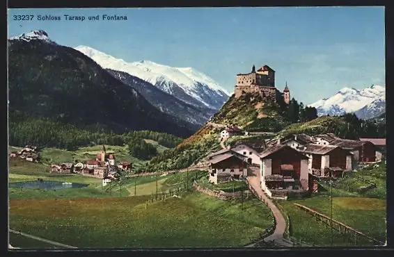 AK Tarasp, Schloss Tarasp und Ortsteil Fontana mit der Dreifaltigkeitskirche
