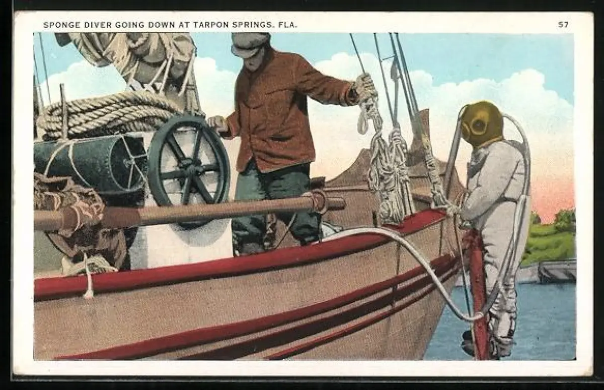 AK Tarpon Springs, Fla, Sponge Diver going down, Taucher im Taucheranzug