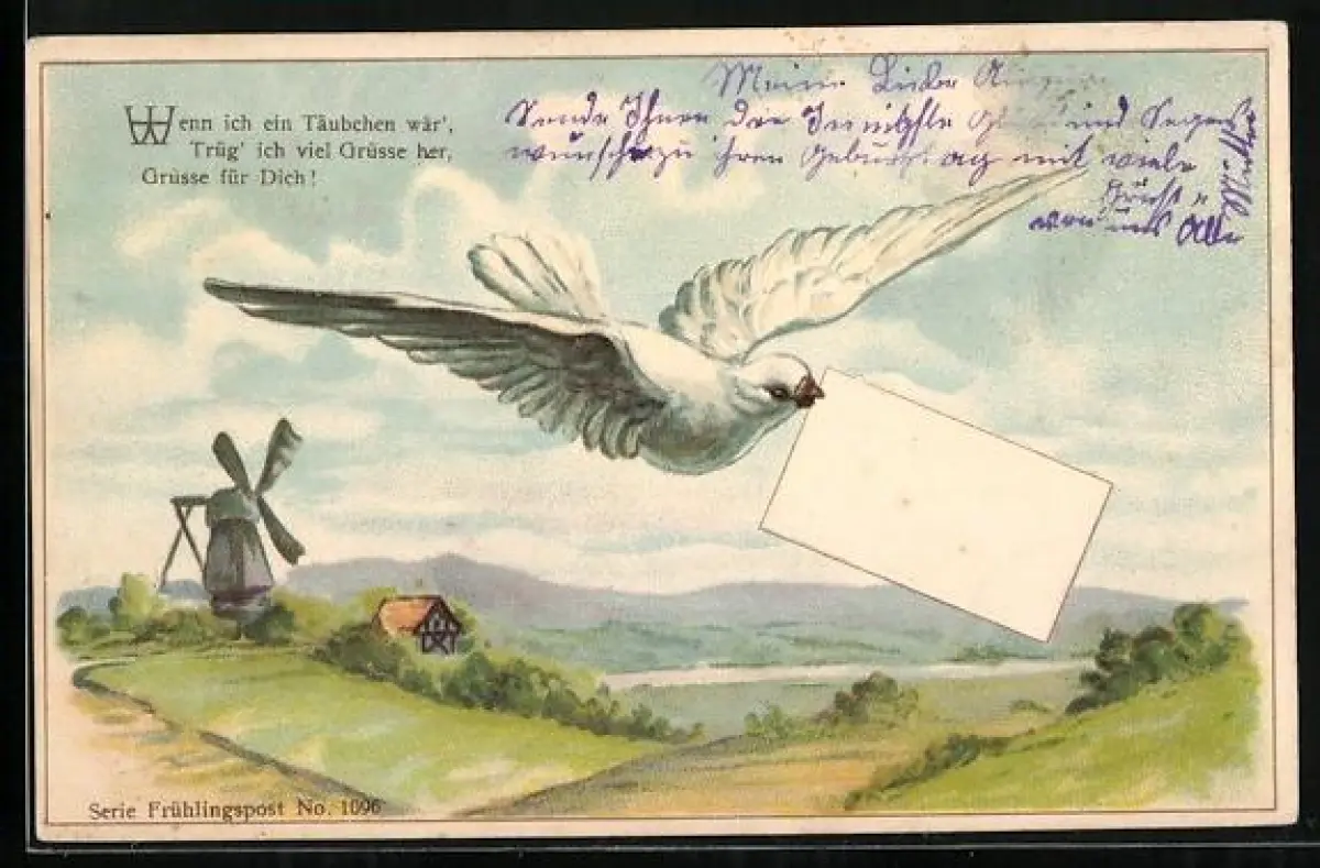 AK Taube mit Kuvert im Schnabel, Im Hintergrund Windmühle