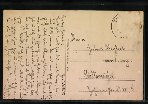 Personenbezogene Daten auf der Rückseite der Karte wurden durch blauen Textmarker unkenntlich gemacht. Die blauen Stellen sind auf die Vorderseite durchgeweicht und wirken sich negativ auf das Postkartenfoto aus