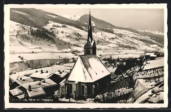 AK Taxenbach im Pinzgau, Ortspartie mit Kirche im Schnee