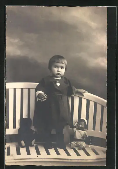 AK Teddy, Mädchen auf einer Bank mit ihren Spielsachen