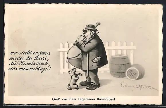 AK Tegernsee, Gruss vom Tegernseer Bräustüberl - Dicknbäuchiger Mann übersieht seinen Hund