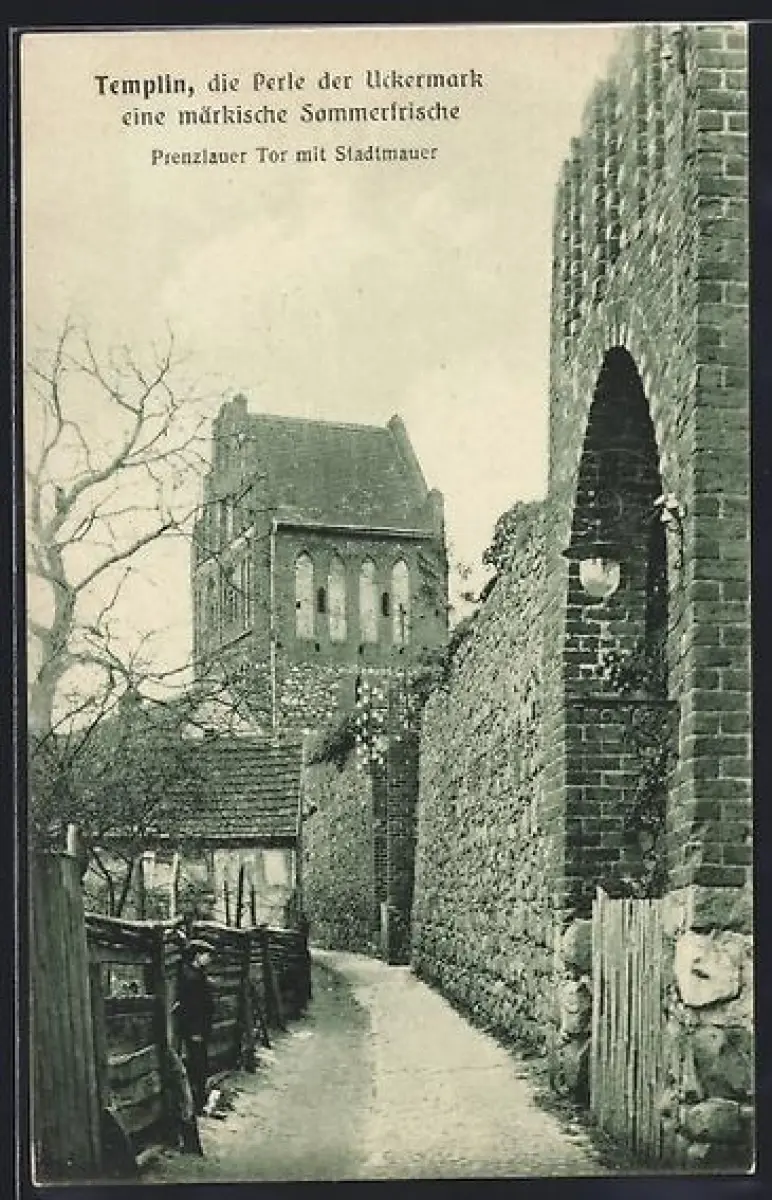 AK Templin / Uckermark, Prenzlauer Tor mit Stadtmauer