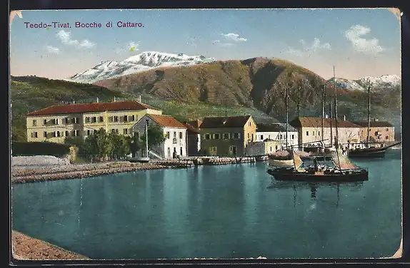 AK Teodo / Tivat, Bocche di Cattaro, Blick zum Ort, Segelboote