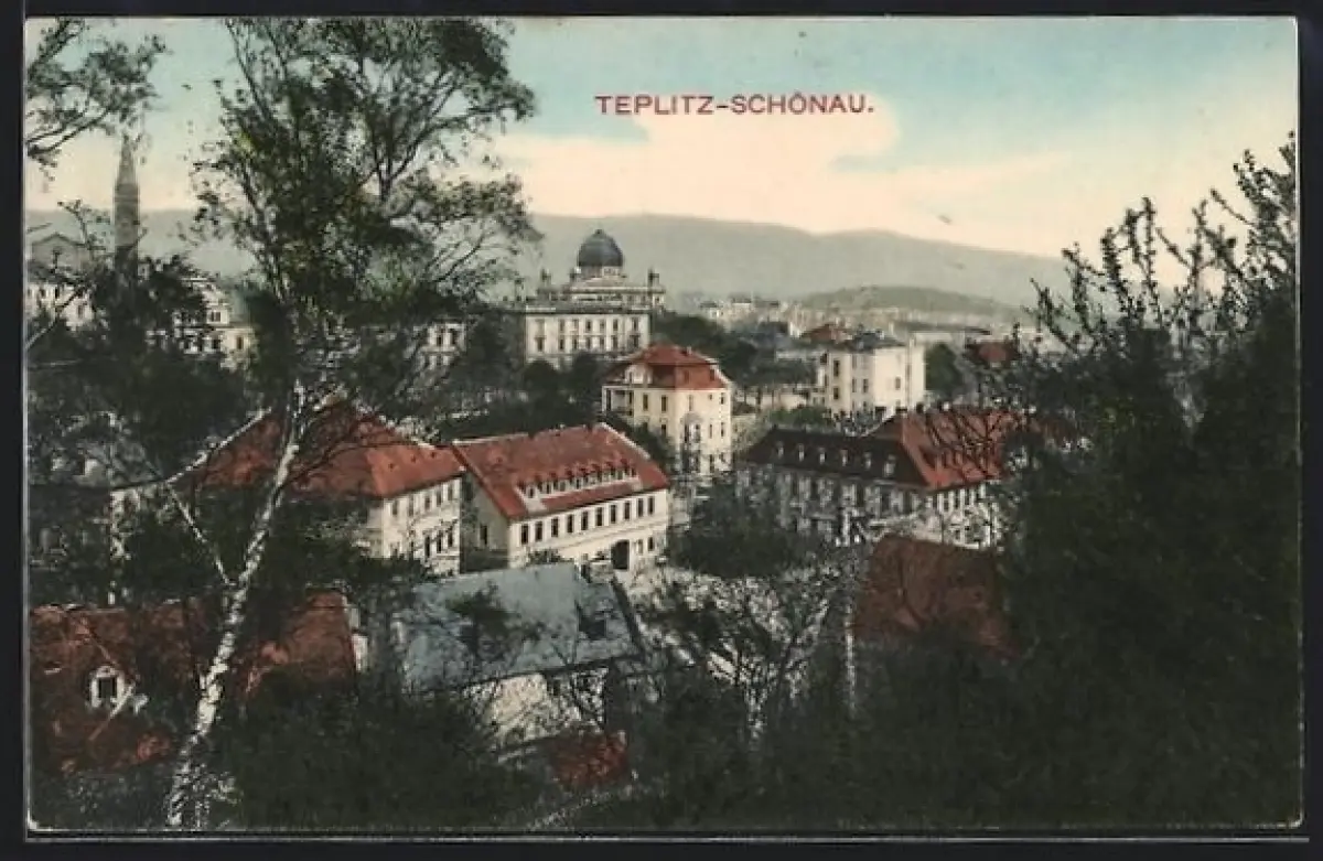 AK Teplitz-Schönau, Ortsansicht mit Synagoge