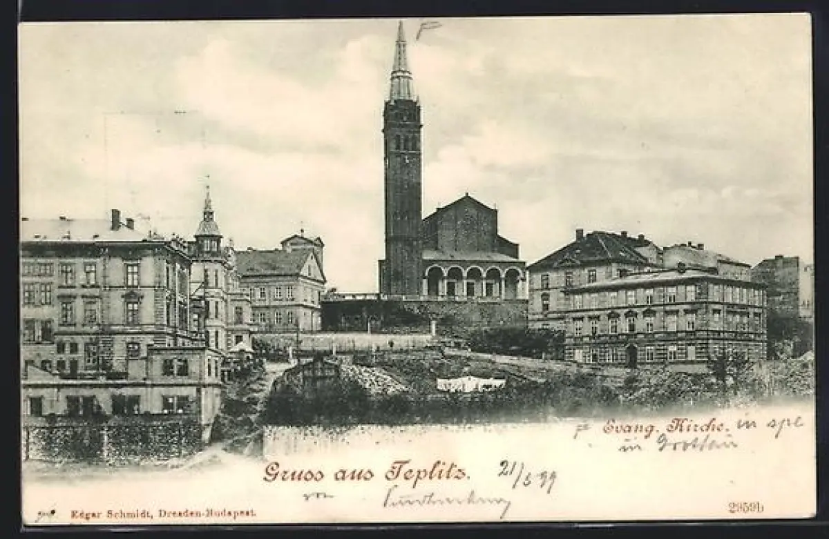 AK Teplitz Schönau / Teplice, Blick zur Evang. Kirche