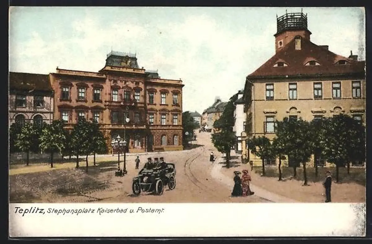 AK Teplitz, Stephansplatz mit Kaiserbad und Postamt