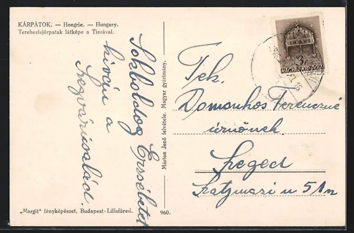 Personenbezogene Daten auf der Rückseite der Karte wurden durch blauen Textmarker unkenntlich gemacht. Die blauen Stellen sind auf die Vorderseite durchgeweicht und wirken sich negativ auf das Postkartenfoto aus