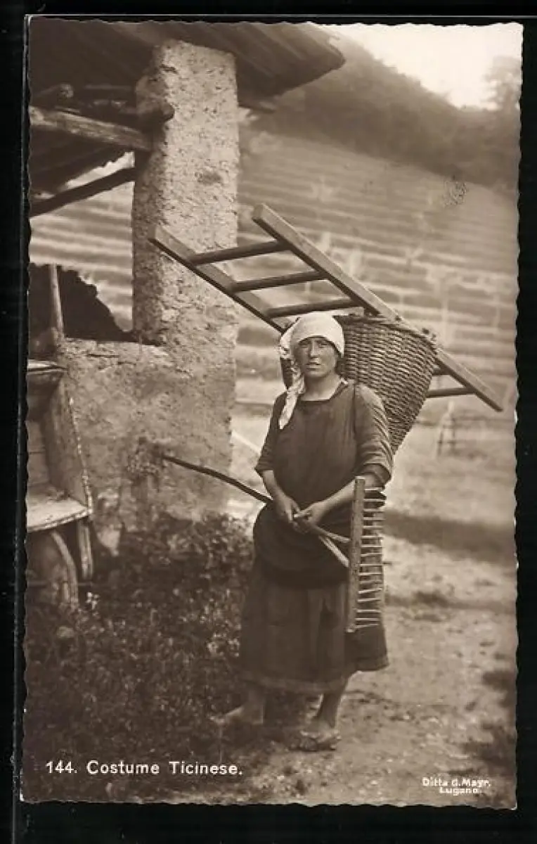 AK Tessin, Costume Ticinese, Schweizerin mit Rechen