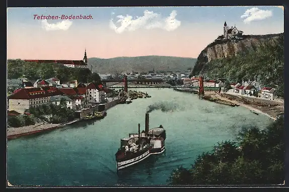 AK Tetschen-Bodenbach, Elbpartie mit Brücke & Dampfer