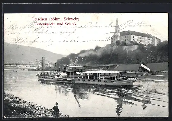 AK Tetschen /Böhm. Schweiz, Dampfer Karlsbad passiert das Schloss