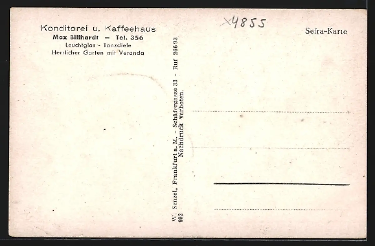 Personenbezogene Daten auf der Rückseite der Karte wurden durch blauen Textmarker unkenntlich gemacht. Die blauen Stellen sind auf die Vorderseite durchgeweicht und wirken sich negativ auf das Postkartenfoto aus