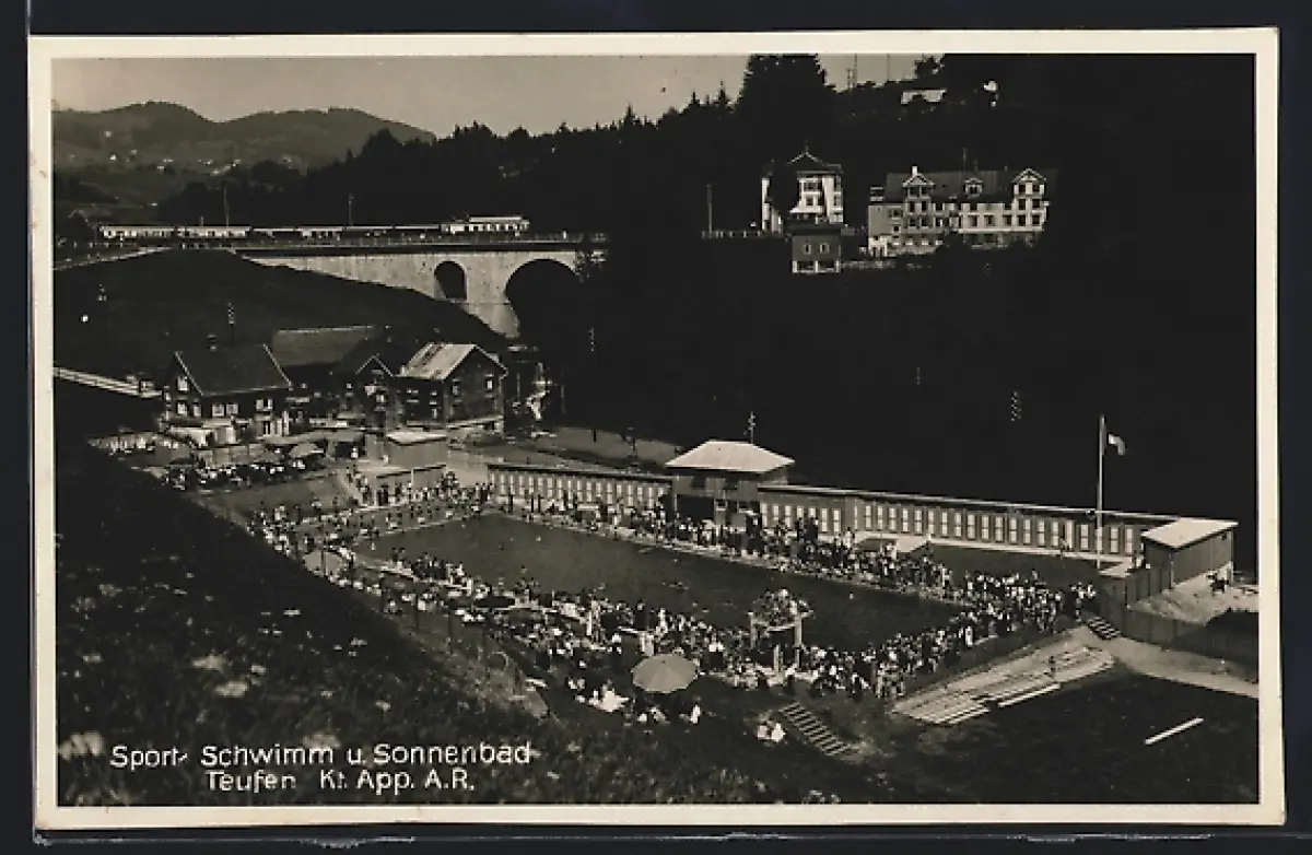 AK Teufen /App., Schwimmbad mit Gebäuden und Brücke aus der Vogelschau