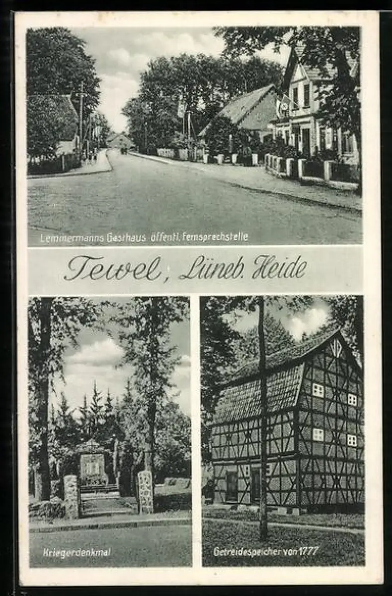 AK Tewel /Lüneb. Heide, Lemmermanns Gasthaus, Kriegerdenkmal, Getreidespeicher