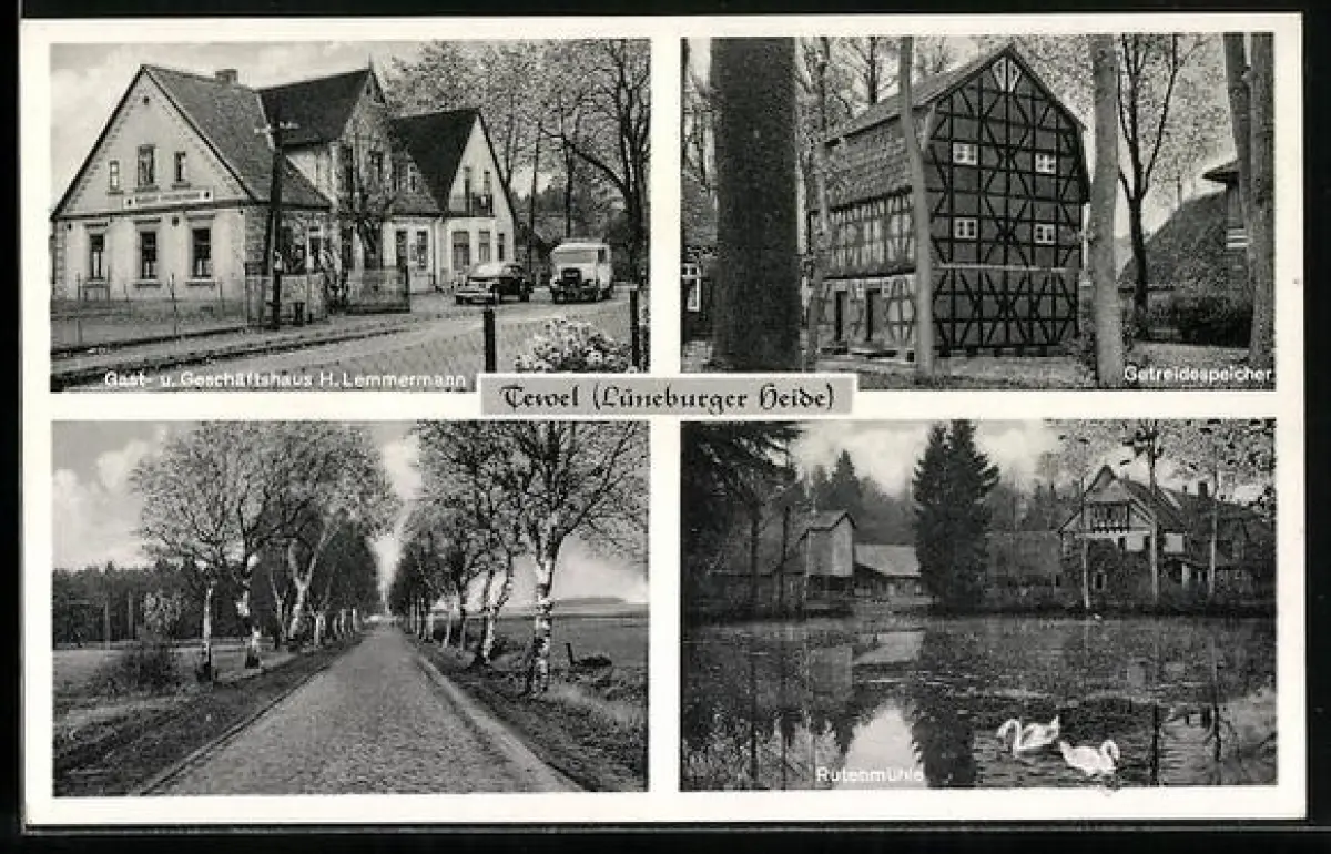 AK Tewel i. Lüneburger Heide, Ortsansicht mit Gasthaus Lemmermann und Rutenmühle