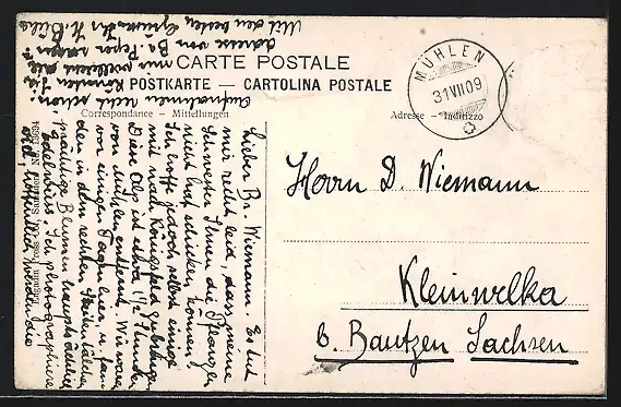 alte Ansichtskarte, gelaufen, Briefmarke entfernt, rückseitig Oberflächenschaden, guter Zustand
