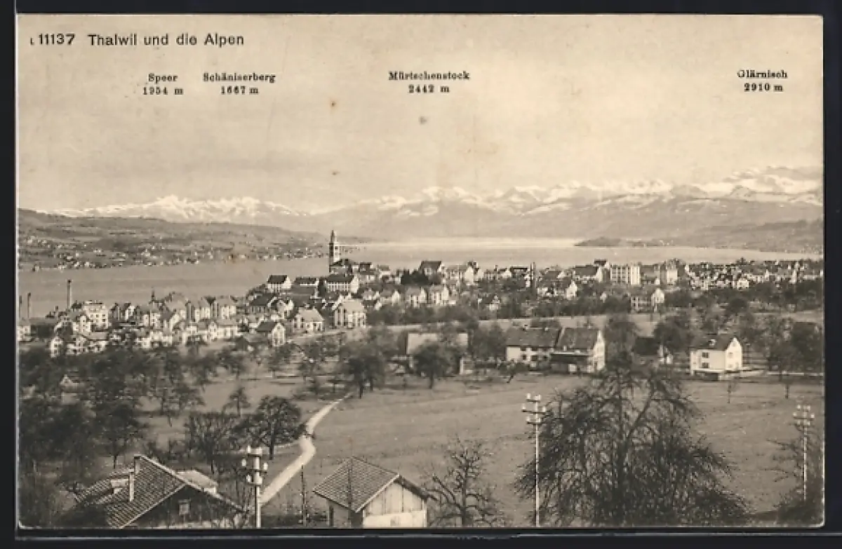 AK Thalwil, Ortsansicht mit Alpen, Speer, Schäniserberg, Mürtschenstock, Glärrnisch