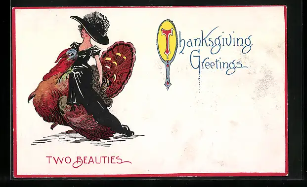 AK Thanksgiving Greetings, Dame reitet auf einem Truthahn