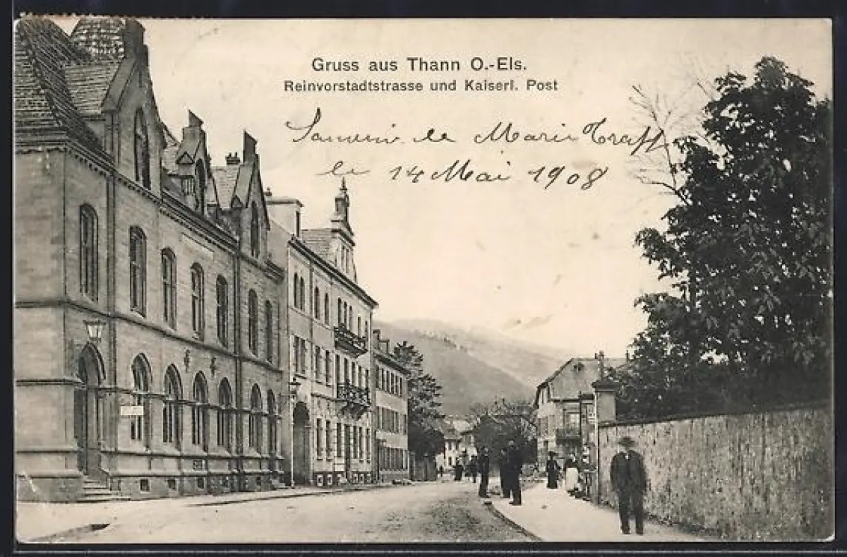 AK Thann /O.-Els., Reinvorstadtstrasse m. Kaiserl. Post