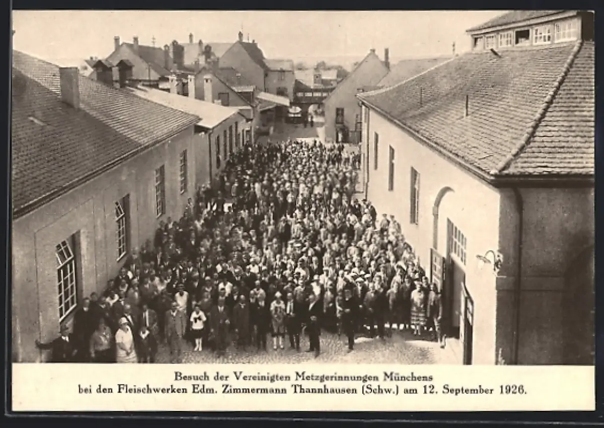 AK Thannhausen /Schw., Besuch der Vereinigten Metzgerinnung Münchens bei den Fleischwerken E. Zimmermann am 12.9.1926