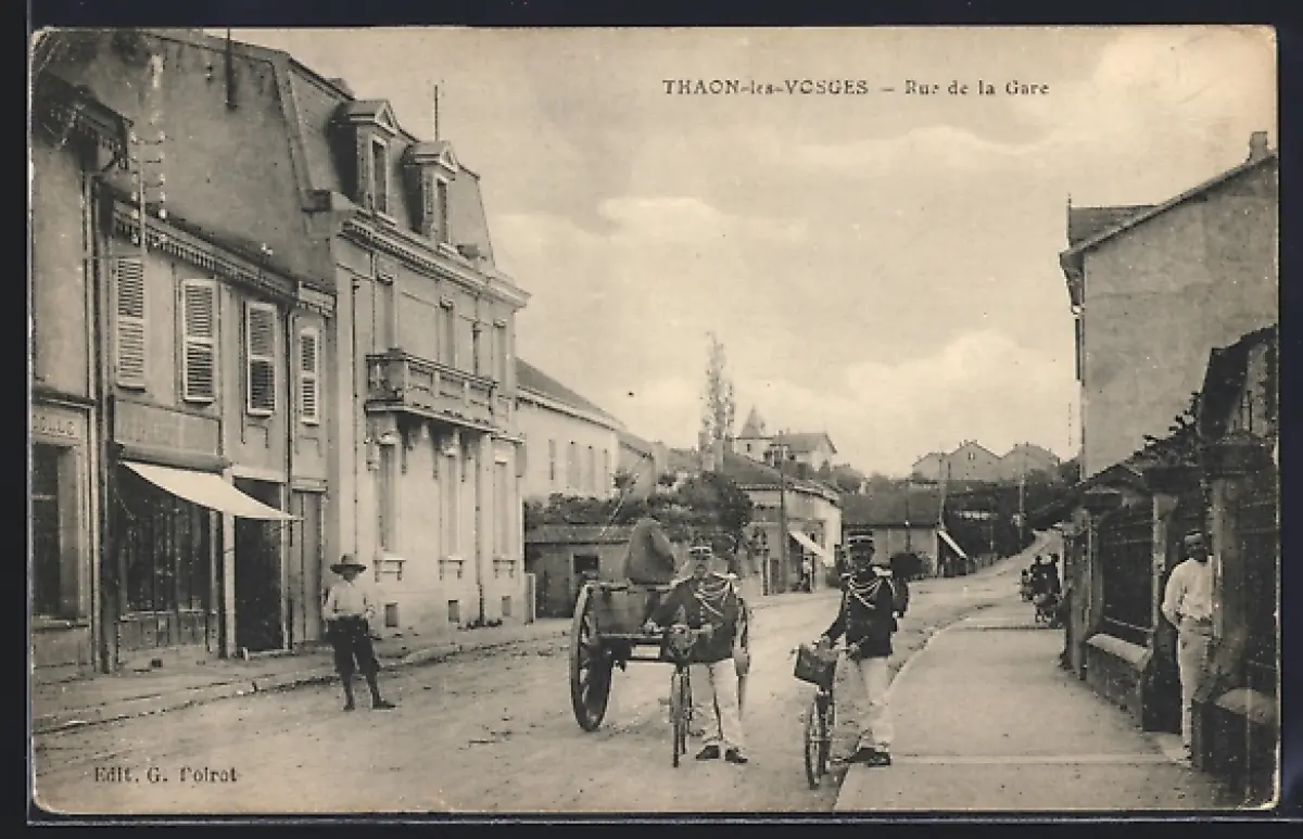 AK Thaon-les-Vosges, Rue de la Gare avec soldats et charrette