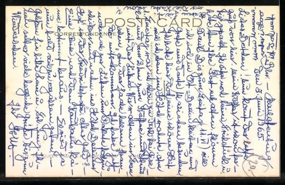 Personenbezogene Daten auf der Rückseite der Karte wurden durch blauen Textmarker unkenntlich gemacht. Die blauen Stellen sind auf die Vorderseite durchgeweicht und wirken sich negativ auf das Postkartenfoto aus