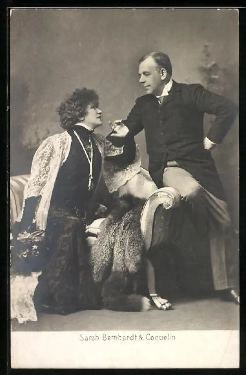 AK Theaterschauspielerin Sarah Bernhardt und Theaterschauspieler Coquelin auf einem Sofa sitzend