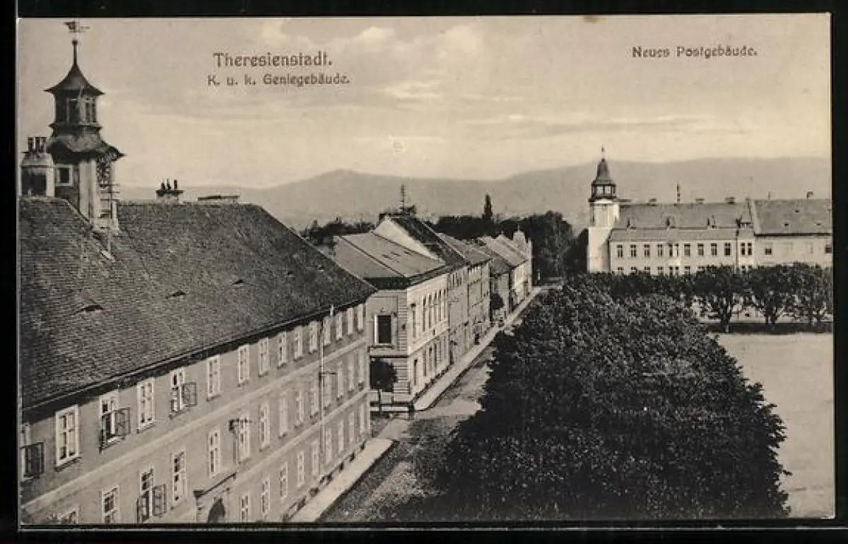 AK Theresienstadt / Terezin, Blick auf K. u. k. Geniegebäude und neues Postgebäude