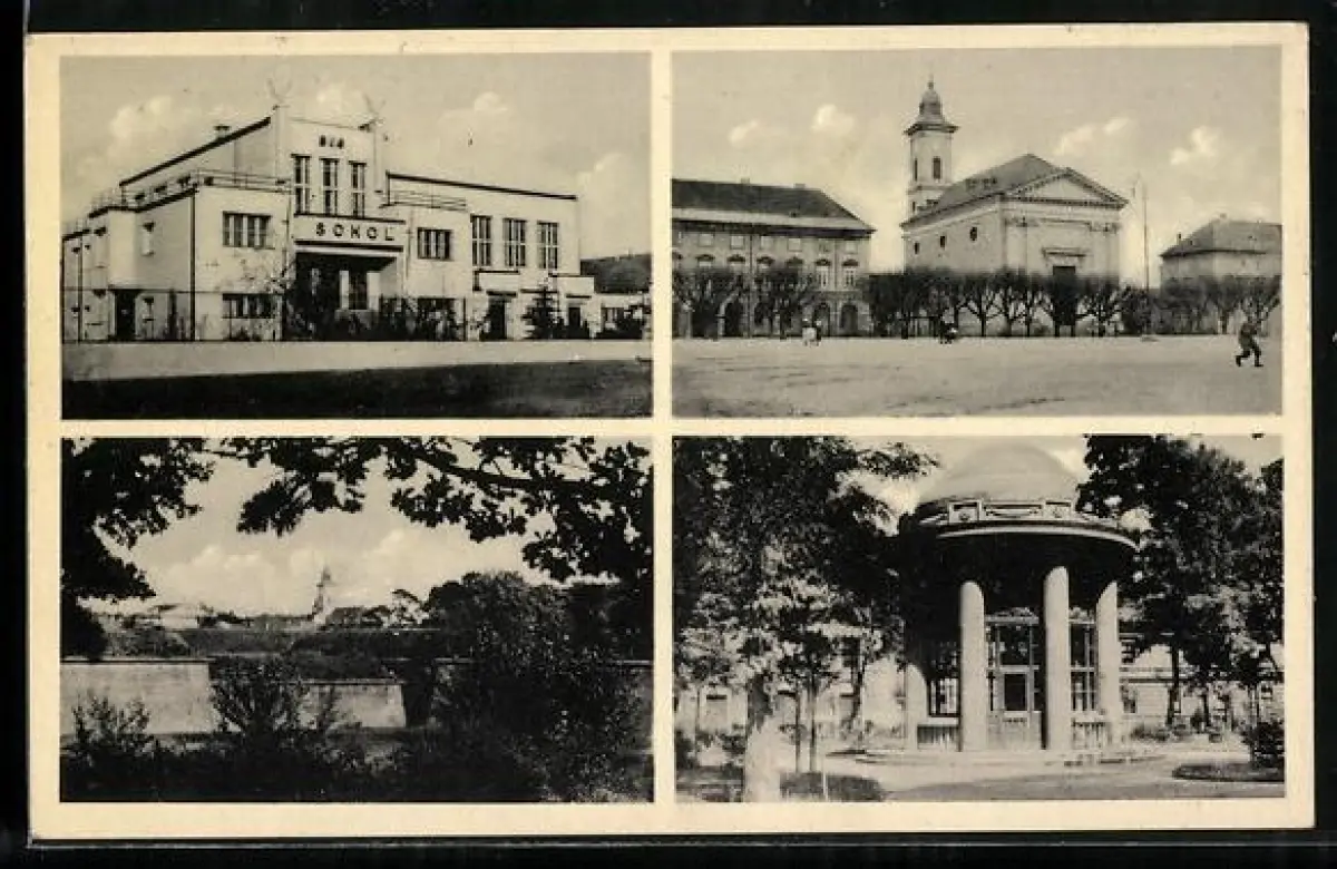 AK Theresienstadt / Terezin, Sokol, Kirche, Pavillon, Partie am Fluss