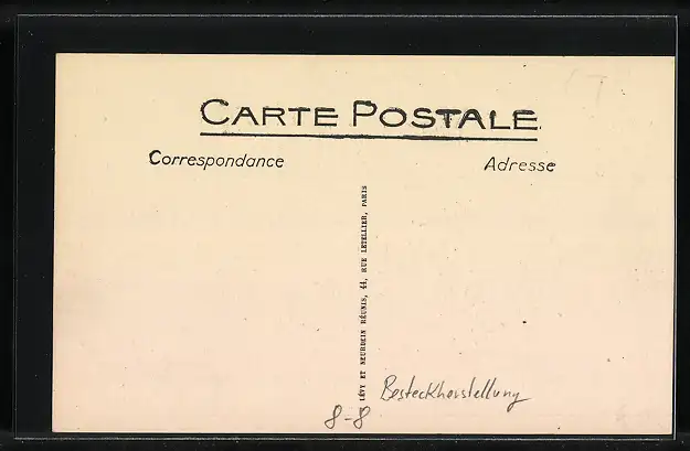 Personenbezogene Daten auf der Rückseite der Karte wurden durch blauen Textmarker unkenntlich gemacht. Die blauen Stellen sind auf die Vorderseite durchgeweicht und wirken sich negativ auf das Postkartenfoto aus