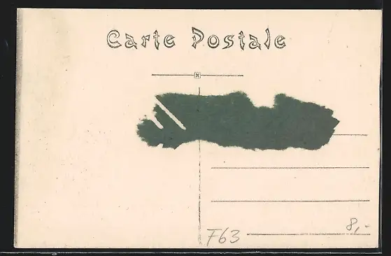 Personenbezogene Daten auf der Rückseite der Karte wurden durch blauen Textmarker unkenntlich gemacht. Die blauen Stellen sind auf die Vorderseite durchgeweicht und wirken sich negativ auf das Postkartenfoto aus