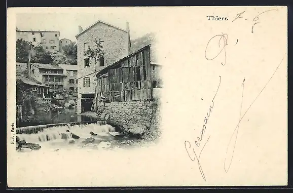 AK Thiers, Vue sur les bâtiments au bord de la rivière avec cascade