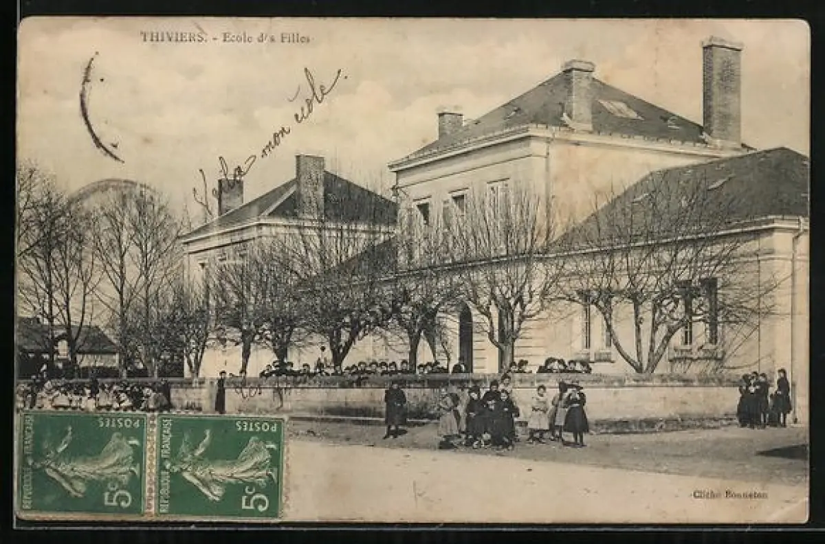 AK Thiviers, École de Filles avec élèves devant les bâtiments en hiver