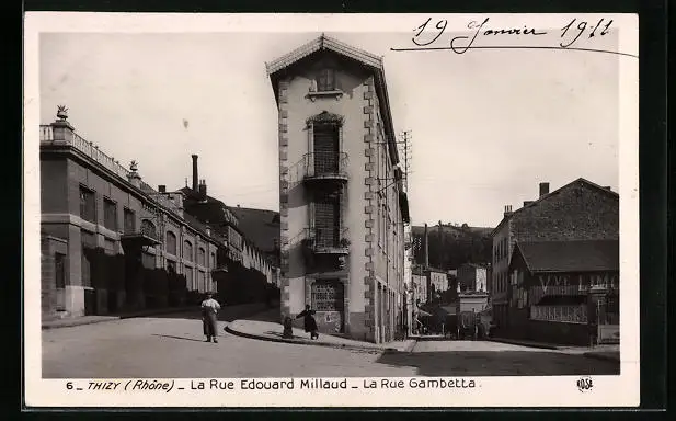 AK Thizy, la Rue Edouard Millaud, la Rue Gambetta