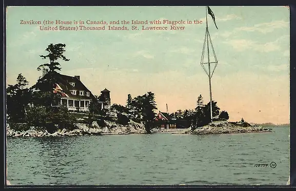 AK Thousand Islands, NY, Zavikon, the House is in Canada and the island with the Flagpole in the United States