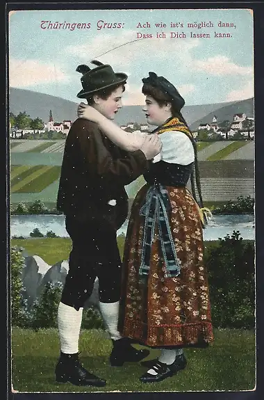 AK Thüringisches Trachtenpaar umarmt sich auf der Wiese