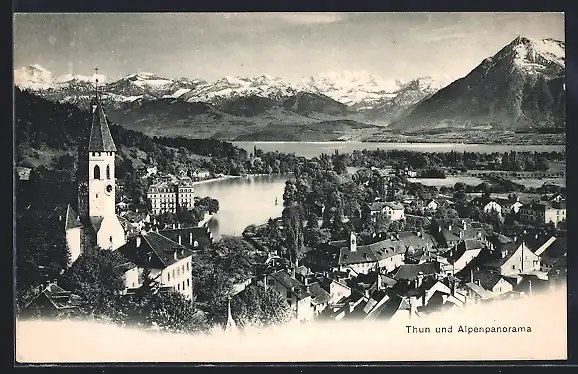 AK Thun, Ortsansicht mit Kirche und Alpenpanorama
